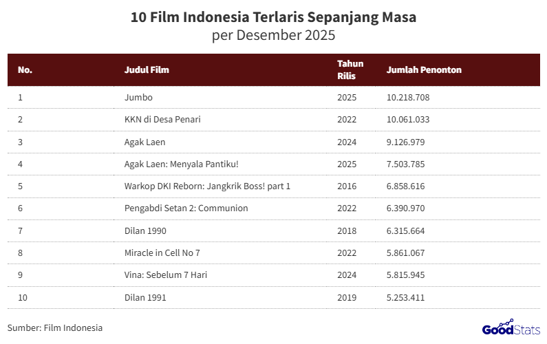 Film Indonesia terlaris dipegang oleh Jumbo. Film yang baru dirilis di tahun 2025 ini langsung menyabet posisi puncak sebagai film Indonesia terlaris dengan total penonton mencapai 10.218.708. Jumbo berhasil menembus angka psikologis 10 juta, menandai rekor baru dan menjadi film dengan penonton terbanyak saat ini.
