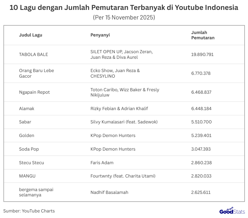 Lagu-lagu yang semula hanya populer di komunitas tertentu kini mampu menembus arus utama berkat kekuatan media sosial dan kreativitas musisi independen. Fenomena itu kembali tampak dalam daftar lagu yang paling sering diputar di YouTube Indonesia per 15 November 2025. Berikut ini rangkuman performa sepuluh lagu teratas yang paling banyak diputar.