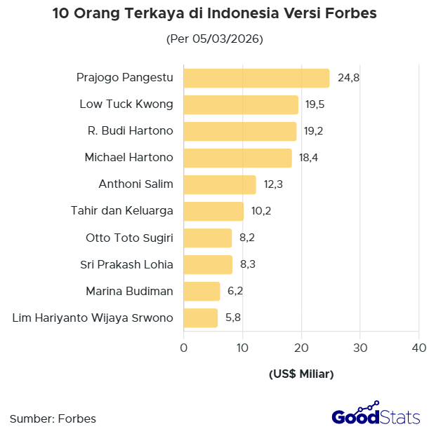 Berdasarkan data Forbes per 5 Maret 2026, kekayaan para miliarder ini berasal dari berbagai sektor industri strategis, mulai dari sektor energi hingga perbankan. Berikut daftar 10 orang terkaya di Indonesia berdasarkan estimasi kekayaan terbaru dari Forbes.