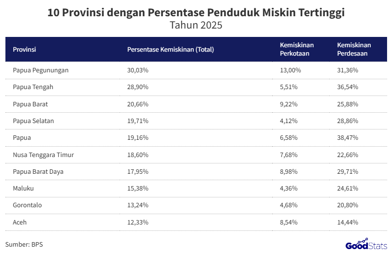 Berdasarkan data terbaru dari Badan Pusat Statistik (BPS) mengenai persentase penduduk miskin menurut provinsi tahun 2025, terlihat adanya ketimpangan yang cukup mencolok antar wilayah di Indonesia. Meskipun rata-rata nasional berada di angka 8,47%, beberapa daerah masih berjuang dengan angka kemiskinan yang jauh di atas angka tersebut. Berikut adalah sepuluh provinsi dengan persentase penduduk miskin terbanyak tahun 2025.