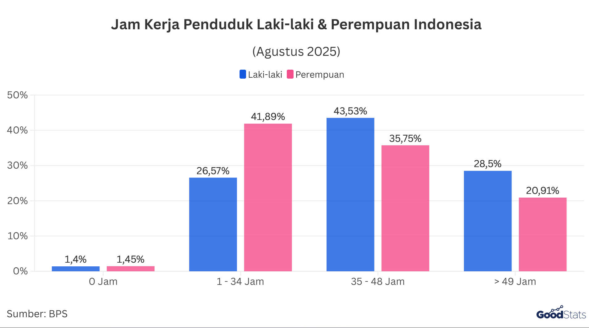 Jika dilihat dari sisi gender, perbedaan jam kerja terlihat cukup jelas. Pekerja laki-laki lebih banyak mendominasi kelompok jam kerja panjang. Sebanyak 28,50% pekerja laki-laki bekerja lebih dari 49 jam per minggu, jauh lebih tinggi dibanding perempuan yang berada di angka 20,91%.