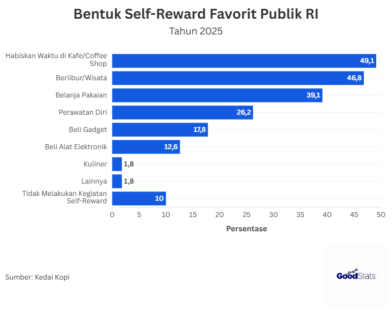 Bentuk self-reward sendiri sangat beragam, seperti membeli barang yang diinginkan, liburan atau sekedar makan kuliner favorit. Berdasarkan survei yang dilakukan oleh Kedai Kopi, sebanyak 49,1% responden kelas menengah di Indonesia memilih menghabiskan waktu di kafe sebagai kegiatan self-reward yang paling banyak dilakukan dalam satu bulan terakhir.