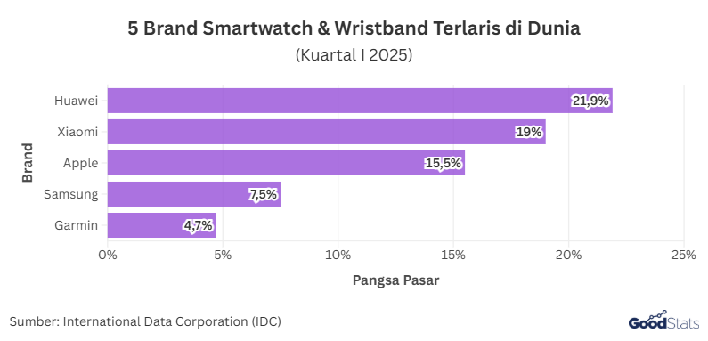 Menurut laporan Worldwide Quarterly Wearable Device Tracker dari International Data Corporation (IDC), pengiriman perangkat wearable berbasis pergelangan tangan yang mencakup smartwatch dan wristband mencapai 45,6 juta unit pada Kuartal I 2025, naik 10,5% dibanding tahun sebelumnya (year-on-year/yoy). Pasar yang kian ramai membuat lima brand besar bersaing ketat memperebutkan posisi teratas. Berikut deretan merek yang paling laris di dunia tahun ini.