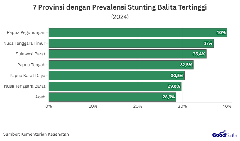 Papua Pegunungan menduduki peringkat pertama dengan prevalensi stunting mencapai 40%. Di posisi kedua terdapat Nusa Tenggara Timur (NTT) dengan 37%. Sulawesi Barat menyusul dengan persentase 35,4%, diikuti Papua Tengah dengan 32,5%.