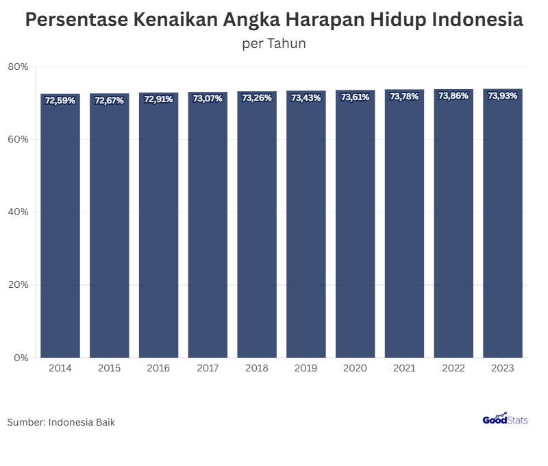 Angka harapan hidup Indonesia terus mengalami perbaikan yang cukup signifikan setiap tahunnya. Data BPS menunjukkan adanya kenaikan angka harapan hidup atau AHH di Indonesia dengan rata-rata 0,24 –0,30% setiap tahunnya dalam satu dekade terakhir. Misalnya, selama periode 2010 hingga 2019, umur harapan hidup saat lahir meningkat sebesar 1,53 tahun atau sekitar 0,24% per tahun.