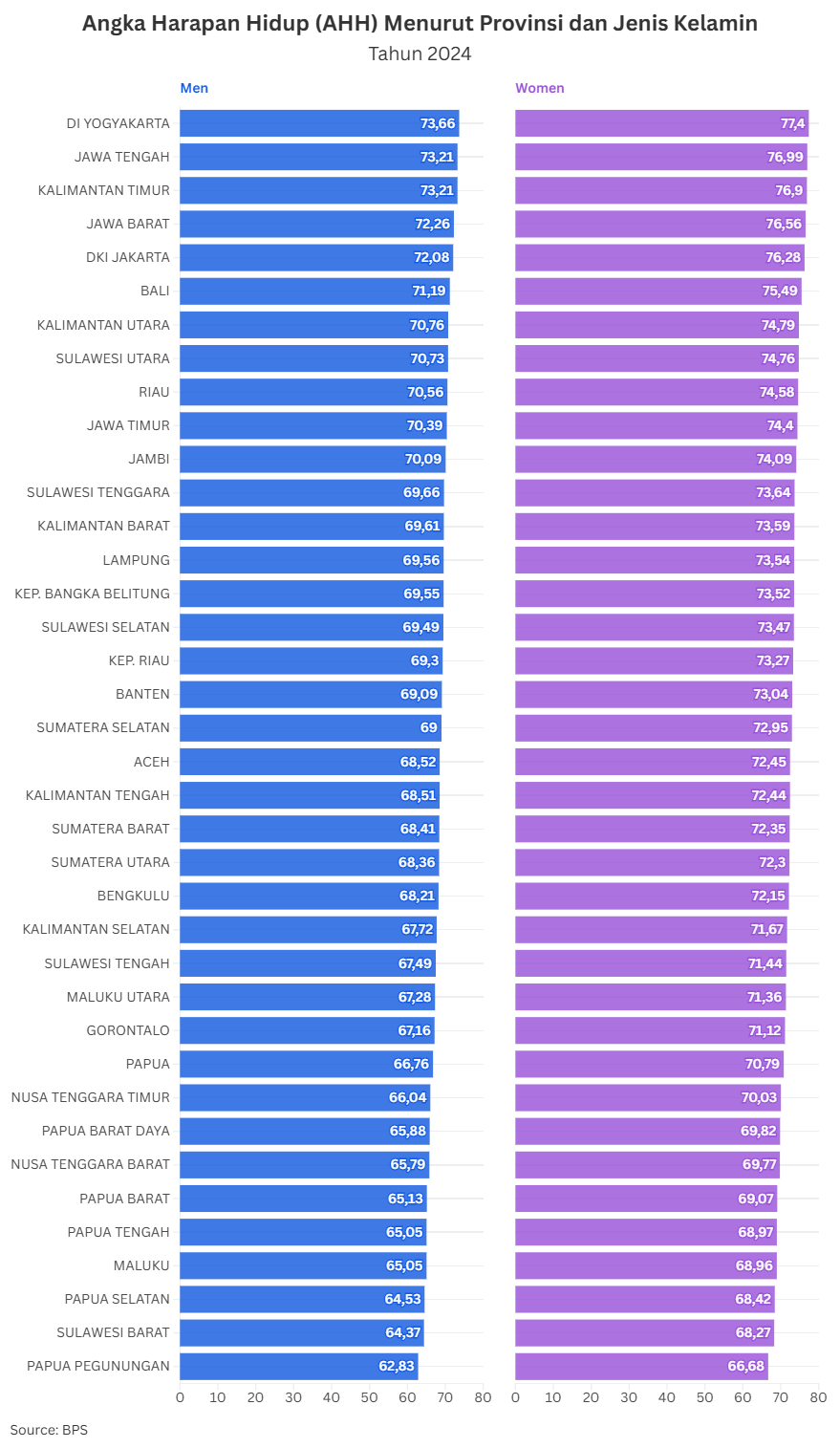 Berdasarkan data BPS 2024, DI Yogyakarta menjadi provinsi dengan angka harapan hidup tertinggi dengan persentase 73,66% untuk laki-laki dan 77,4% bagi perempuan. Diikuti dengan Jawa Tengah sebesar 73,21% dan 76,99% pada peringkat kedua, dan Kalimantan Timur pada peringkat di bawahnya dengan angka harapan hidup 73,21% dan 76,9%. Menunjukan adanya arah pemerataan penyediaan layanan kesehatan yang semakin baik dan merata.