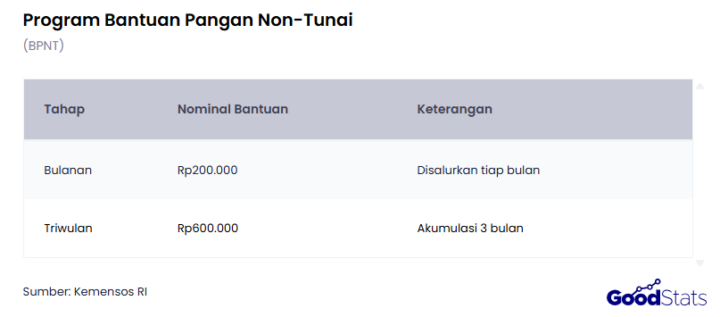 BPNT atau Program Sembako berfokus pada pemenuhan kebutuhan pangan masyarakat. Bantuan ini diberikan secara rutin setiap bulan dengan nominal Rp200.000, yang dapat diakumulasikan menjadi Rp600.000 jika dicairkan per triwulan.