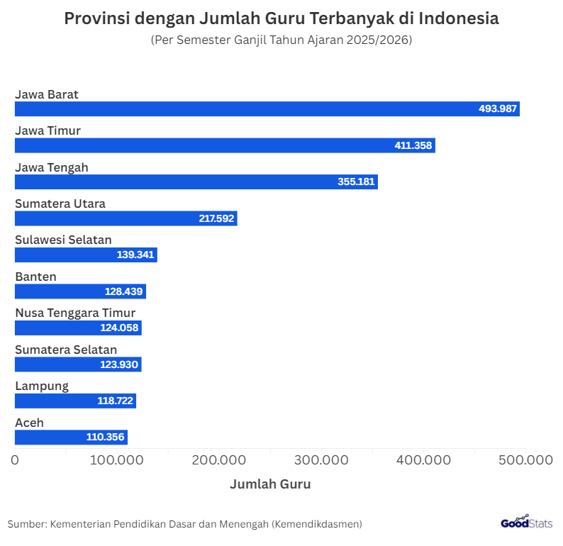 Adapun provinsi yang memiliki jumlah guru terbanyak di Indonesia berturut-turut berasal dari Pulau Jawa, yaitu Jawa Barat (493.987 guru), Jawa Timur (411.358 guru), dan Jawa Tengah (355.181 guru). Jika ditotal, jumlah keseluruhan guru di Jawa mencapai 1.532.764, jauh lebih banyak ketimbang jumlah guru di wilayah timur Indonesia.