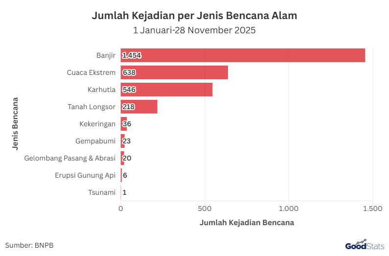 Badan Nasional Penanggulangan Bencana (BNPB) mencatat sepanjang 1 Januari hingga 28 November 2025, terdapat 2.942 bencana alam yang terjadi di Indonesia dengan lebih dari 70% di antaranya merupakan banjir dan cuaca ekstrem. Kondisi ini sejalan dengan situasi yang terjadi di berbagai wilayah terutama di Pulau Sumatra yang dalam beberapa hari terakhir dihantam hujan deras hingga mengakibatkan banjir besar dan tanah longsor.