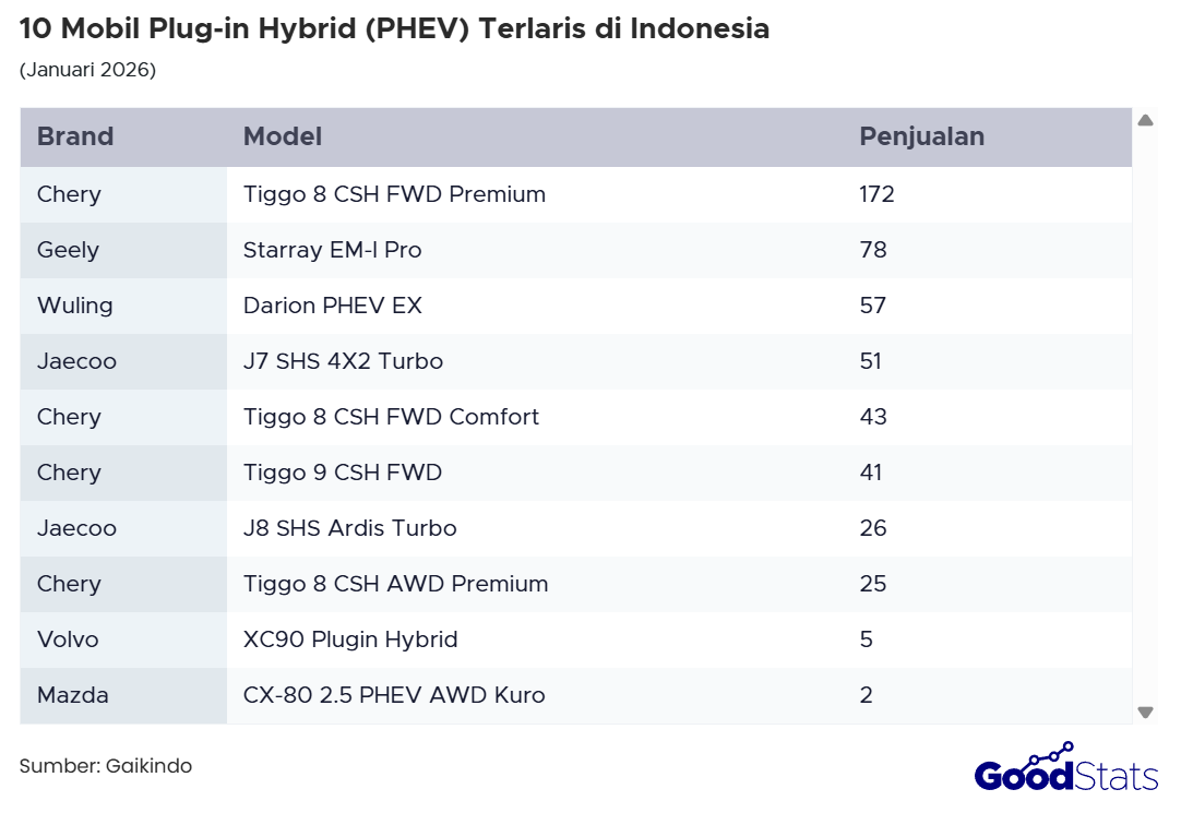 Berbeda dengan dua segmen sebelumnya, pasar PHEV di Indonesia masih relatif kecil. Pada Januari 2026, total distribusinya hanya 502 unit.