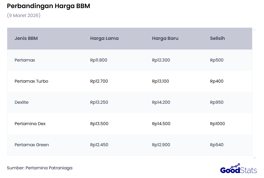 Sebagai perbandingan, berikut rincian perubahan harga BBM pertamina di wilayah Jawa Barat yang berlaku pada awal Maret 2026: