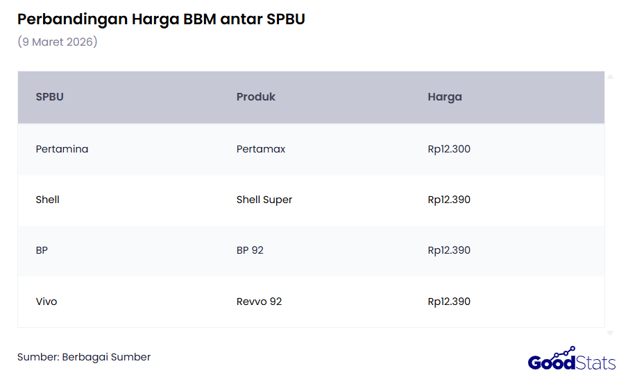 Kenaikan harga tidak hanya berlaku di SPBU Pertamina, tetapi juga di sejumlah SPBU swasta seperti Shell, BP, dan Vivo yang turut menyesuaikan harga BBM mereka. Berikut daftar harga BBM terbaru yang telah diperbarui 9 Maret 2026, di berbagai SPBU di Indonesia.