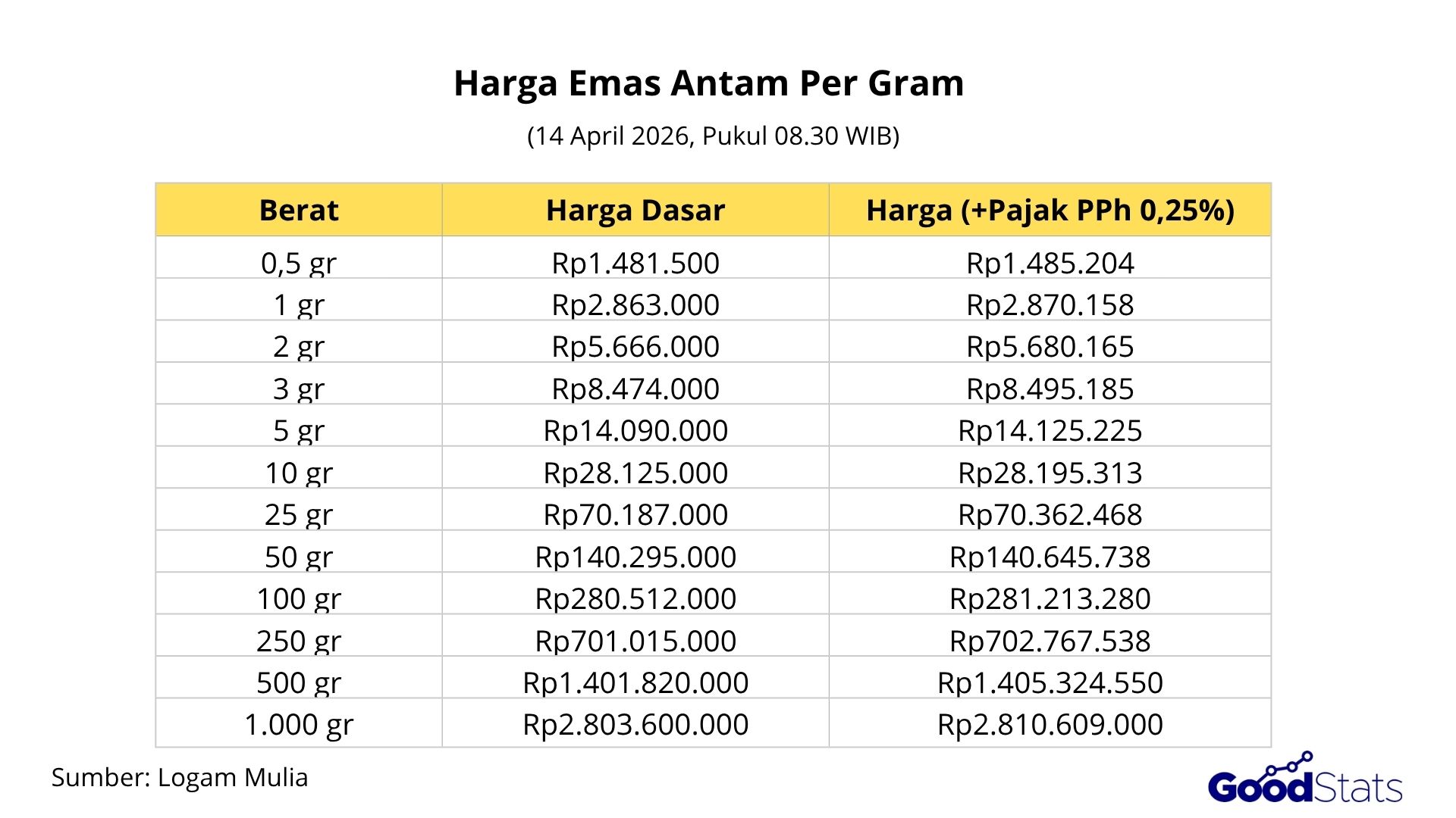 Harga emas antam hari ini Selasa (14 April 2026) pukul 08.30 WIB di Logam Mulia mengalami kenaikan tipis. Berdasarkan informasi terbaru dari laman resmi Logammulia.com, harga emas batangan PT Antam Tbk berada di kisaran Rp2.863.000 per gram. Angka ini naik Rp3.000 dibandingkan harga pada hari sebelumnya yang berada di level Rp2.860.000 per gram.
