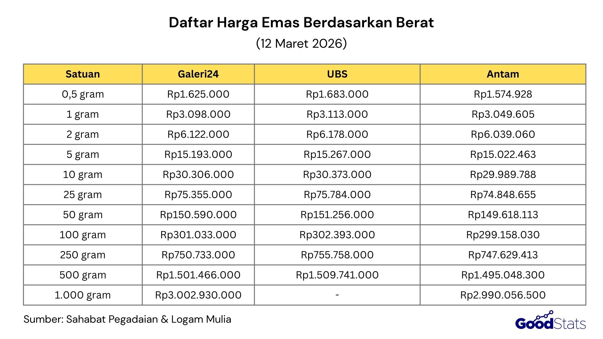 Berikut daftar harga emas per gram berdasarkan beratnya (termasuk PPh 0,25%) pada Kamis, 12 Maret 2026: