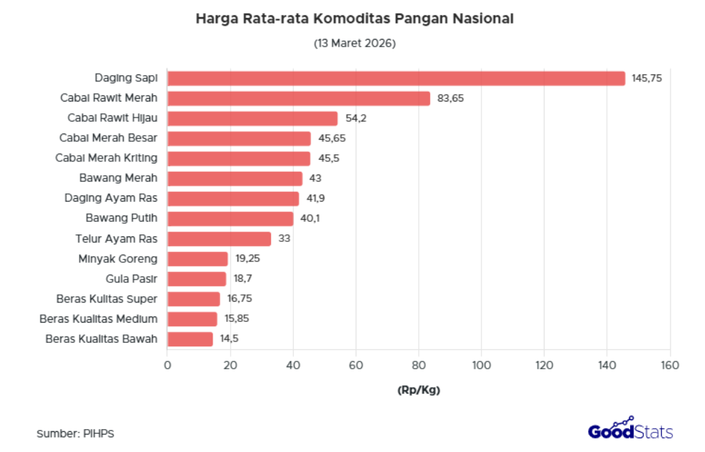 Sebagai makanan pokok masyarakat Indonesia, beras memiliki harga yang relatif lebih stabil dibandingkan komoditas lainnya dalam grafik. Harga beras kualitas bawah tercatat sekitar Rp14,5 ribu per kilogram, sementara beras kualitas medium mencapai sekitar Rp15,85 ribu per kilogram. Adapun beras kualitas super berada di kisaran Rp16,75 ribu per kilogram.