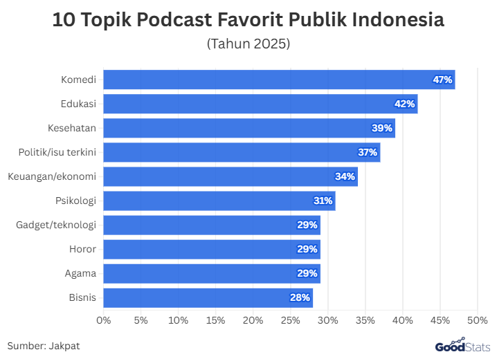 Berdasarkan data tersebut, komedi menduduki peringkat pertama topik favorit pendengar podcast di Indonesia dengan persentase 47%.
