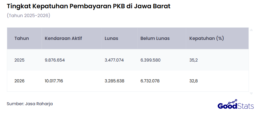 Data menunjukkan bahwa tingkat kepatuhan pembayaran Pajak Kendaraan Bermotor (PKB) di Jawa Barat menurun 5.5% dari tahun sebelumnya. Pada 2025, dari total 9.876.654 kendaraan aktif, hanya 3.477.074 kendaraan yang tercatat telah membayar pajak. Sementara itu, sebanyak 6.399.580 kendaraan lainnya belum memenuhi kewajiban, sehingga tingkat kepatuhan berada di angka 35,2%.