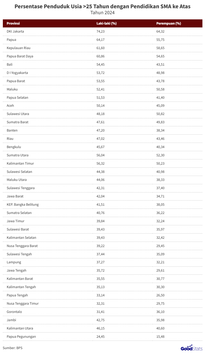 Data terbaru Badan Pusat Statistik (BPS) tahun 2024 menunjukkan adanya kesenjangan signifikan dalam tingkat pendidikan formal di Indonesia, terutama pada penduduk usia 25 tahun ke atas yang telah menamatkan pendidikan minimal setingkat SMA. DKI Jakarta kembali menegaskan posisinya sebagai provinsi dengan tingkat pendidikan tertinggi. Lebih dari tiga perempat penduduk laki-laki usia 25 tahun ke atas, tepatnya 74,23%, telah menamatkan SMA atau lebih tinggi. Angka untuk perempuan, meskipun sedikit di bawah, juga sangat tinggi di 64,32%.