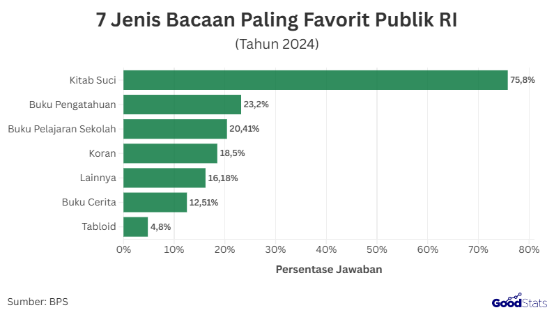 Pada 2024, BPS mensurvei kepada penduduk berusia 5 tahun ke atas tentang jenis bacaan yang seminggu terakhir di baca sebelum survei tersebut. Hasilnya, kitab suci menjadi jenis bacaan yang paling banyak diminati masyarakat Indonesia dengan persentase mencapai 75,8%. Angka ini jauh melampaui jenis bacaan lainnya, menggambarkan kuatnya budaya religius dalam kehidupan sehari-hari masyarakat.