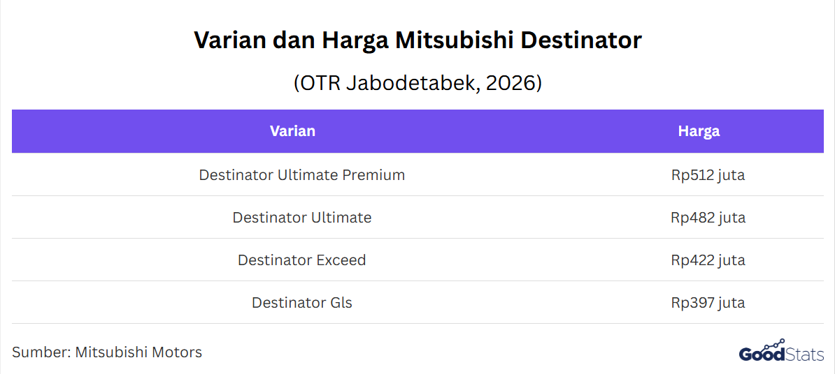 Destinator hadir dengan pilihan yang cukup lengkap. Varian tertinggi Ultimate Premium dipasarkan di kisaran Rp512 juta (OTR Jabodetabek), disusul Ultimate di Rp482 juta. Di bawahnya ada Exceed dengan harga sekitar Rp422 juta, serta GLS sebagai varian termurah di angka Rp397 juta. Dengan rentang harga ini, Mitsubishi mencoba menjangkau konsumen dari kelas menengah hingga atas, tanpa meninggalkan opsi yang lebih terjangkau.