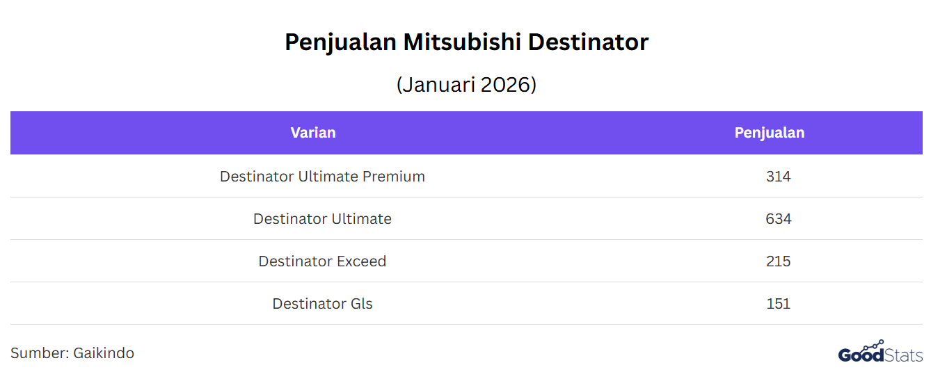 Masuk ke Januari 2026, penjualan Destinator langsung menunjukkan performa yang cukup kuat. Varian Ultimate menjadi yang paling laris dengan penjualan 634 unit dari pabrik ke dealer. Sementara itu, Ultimate Premium mencatatkan 314 unit, menunjukkan bahwa varian termahal tetap diminati.