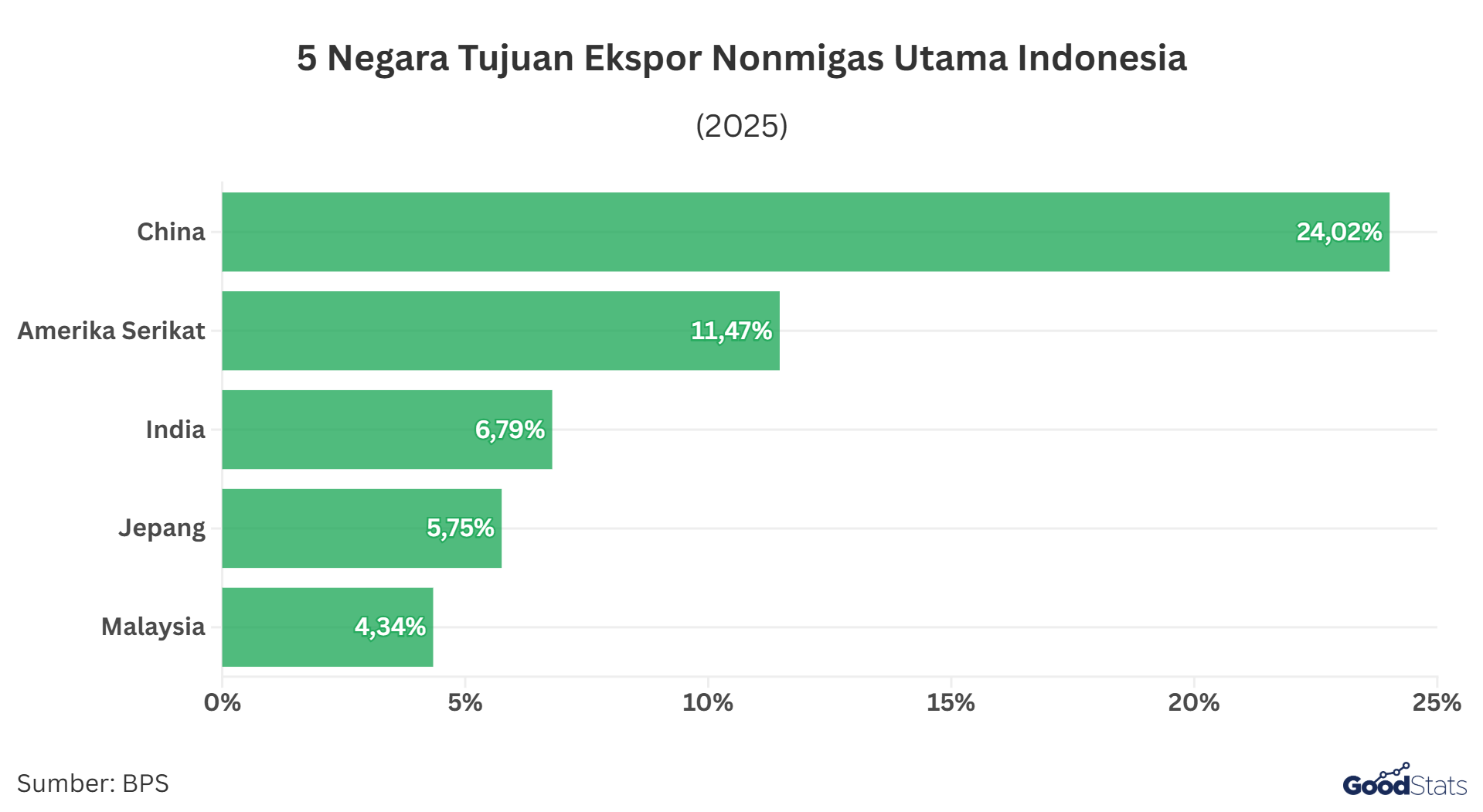 Berdasarkan data Badan Pusat Statistik (BPS), AS menjadi tujuan ekspor nonmigas terbesar kedua Indonesia pada 2025 dengan pangsa 11,47%, di bawah China yang mencapai 24,02%. India berada di posisi ketiga (6,79%), disusul Jepang (5,75%), dan Malaysia (4,34%). Dengan struktur ekspor seperti itu, tarif tinggi berpotensi menekan daya saing dan berdampak pada jutaan pekerja di sektor padat karya.