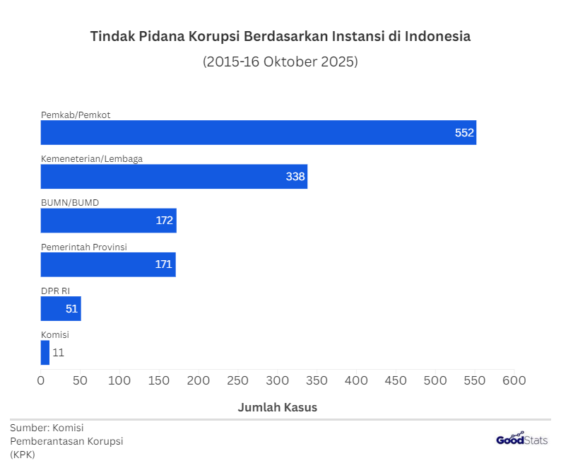 Jika ditinjau dari masing-masing instansi, tindak pidana korupsi paling banyak ditemukan di kalangan pemerintah kabupaten/kota dengan total 552 kasus sepanjang 2015 hingga 2025. Puncaknya terjadi pada 2018, di mana jumlah kasus di kalangan pemerintah kabupaten/kota mencapai 114 perkara.