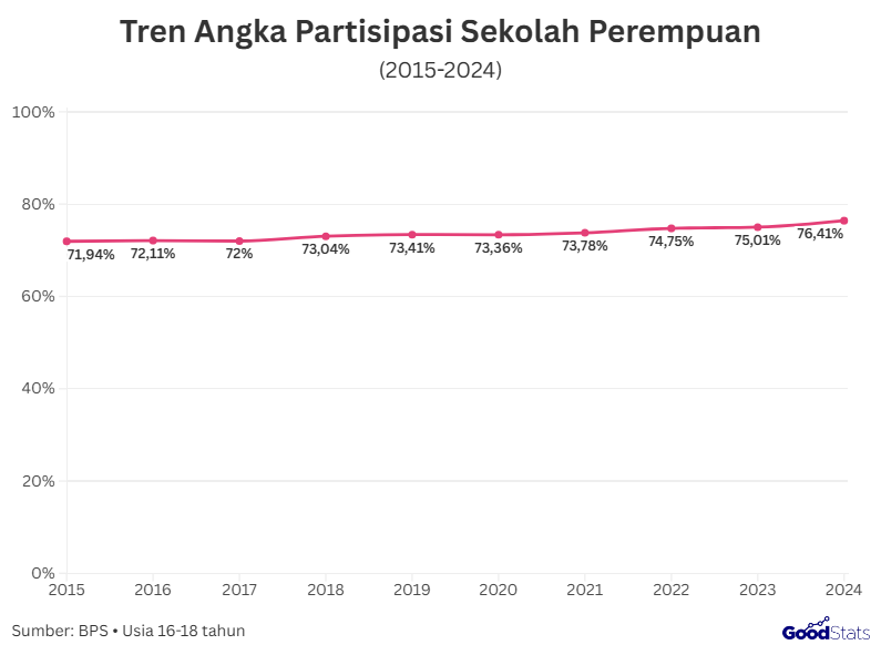 Data BPS memperlihatkan peningkatan yang konsisten pada kelompok usia 16–18 tahun. Dari 71,94% pada 2015, angka tersebut perlahan naik dari tahun ke tahun hingga mencapai 76,41% pada 2024. Meski peningkatannya tidak terlalu besar, tren positif ini menggambarkan upaya berkelanjutan dalam memperluas akses pendidikan bagi perempuan di seluruh Indonesia.