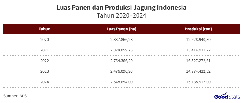 Secara keseluruhan, produksi jagung di Indonesia dari tahun ke tahun mengalami fluktuasi, tetapi data terbaru tahun 2024 menunjukkan adanya kenaikan dibanding tahun 2023. Hal ini terlihat dari meningkatnya luas panen jagung pipilan yang mencapai sekitar 2,55 juta hektare. Produksi jagung kering dengan kadar air 14% pada tahun tersebut juga tercatat sebesar 15,14 juta ton. Beberapa provinsi seperti Jawa Timur, Jawa Tengah, Sumatera Utara, dan Nusa Tenggara Barat menjadi penyumbang terbesar terhadap total produksi nasional. Perubahan produksi setiap tahunnya dipengaruhi oleh berbagai faktor, termasuk kondisi iklim seperti El Nino, metode survei yang digunakan, serta proses konversi data dari jagung basah menjadi jagung pipilan kering. Semua faktor ini membuat hasil produksi bisa naik atau turun dari tahun ke tahun.