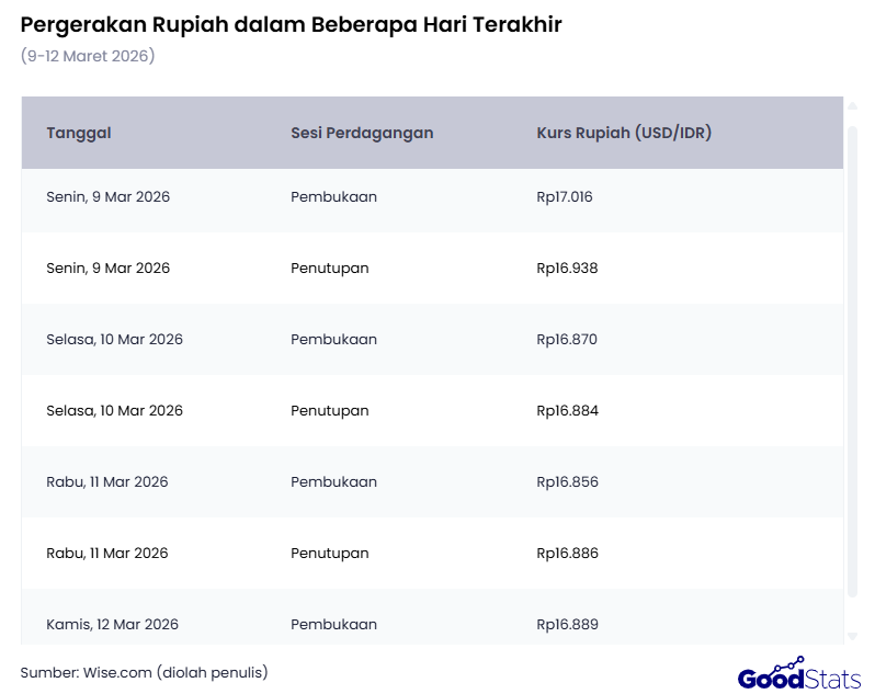 Sementara itu, pada Kamis pagi (12 Maret 2026) rupiah dibuka di kisaran Rp16.889 per dolar AS. Posisi ini menunjukkan bahwa rupiah masih bergerak dalam rentang sempit di sekitar level Rp16.800 hingga Rp17.000 per dolar AS sepanjang pekan ini.