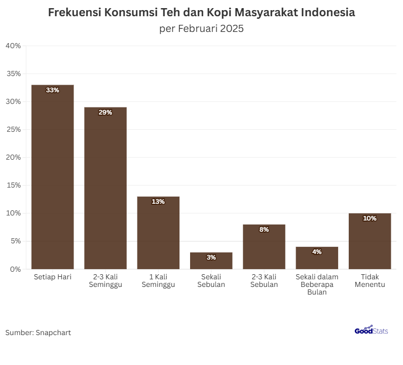 Berdasarkan hasil survei Snapcart pada Februari 2025, ritual minum teh dan kopi tampaknya telah menjadi bintang utama dalam rutinitas harian penduduk Indonesia. Bayangkan saja, sebanyak 33% responden mengaku mengonsumsi minuman ini setiap hari, seolah-olah hari tidak akan benar-benar dimulai tanpa sentuhan kafein atau kehangatan teh di atas meja.