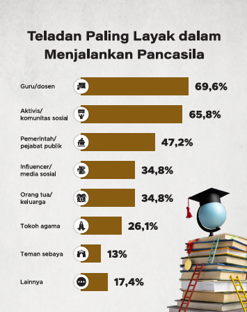 Survei yang rilis pada 2025 ini menyebutkan bahwa guru atau dosen menempati posisi teratas sebagai teladan yang paling layak menjalankan Pancasila, dengan raihan 69,6%. Posisinya diikuti oleh aktivis atau komunitas sosial yang meraih 65,8%, menunjukkan bahwa peran mereka dinilai penting dalam menumbuhkan kesadaran semangat kebangsaan.