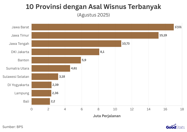 Data terbaru dari Badan Pusat Statistik (BPS) menunjukkan sepuluh provinsi di Indonesia menyumbang wisatawan nusantara (wisnus) terbanyak per Agustus 2025. Di urutan pertama terdapat Jawa Barat dengan total wisnus mencapai 17,1 juta perjalanan, Jawa Timur dengan 15,19 juta perjalanan.