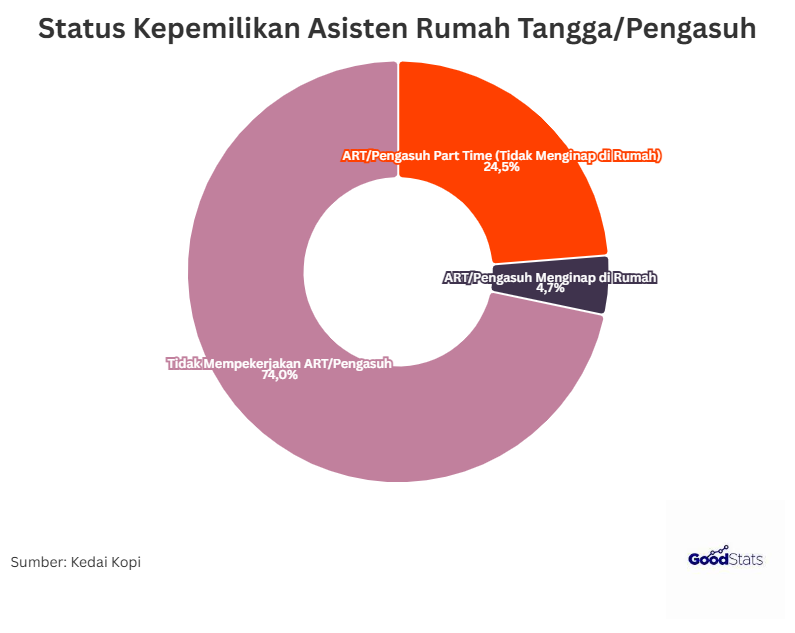 Namun nyatanya, berdasarkan survei yang dilakukan oleh Kedai Kopi, 74% responden kelas menengah di Indonesia memilih untuk mengurus rumah tangga secara mandiri tanpa bantuan asisten rumah tangga atau pengasuh. Sebanyak 24,5% sisanya memiliki asisten rumah tangga atau pengasuh part time yang tidak menginap di rumah, sedangkan 4,7% responden memilih asisten rumah tangga atau pengasuh anak yang menginap di rumah.