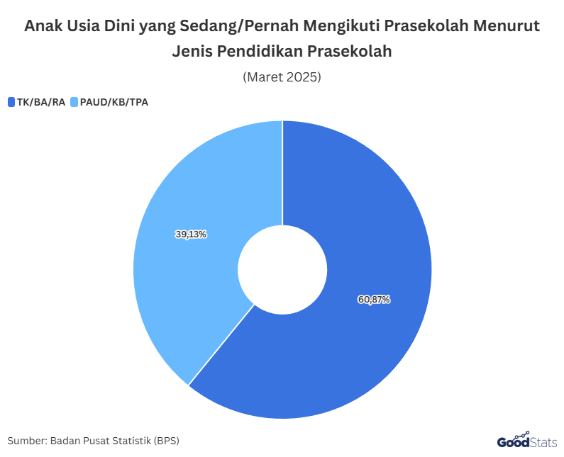 Sejalan dengan meningkatnya partisipasi secara nasional, data 2025 juga menunjukkan bagaimana anak Indonesia mengikuti pendidikan prasekolah melalui berbagai jenis layanan. Sebanyak 60,87% anak usia dini tercatat pernah atau sedang mengikuti pendidikan di TK, Bustanul Athfal (BA), atau Raudatul Athfal (RA). Angka ini menegaskan bahwa layanan pendidikan prasekolah formal masih menjadi pilihan utama mayoritas keluarga Indonesia.