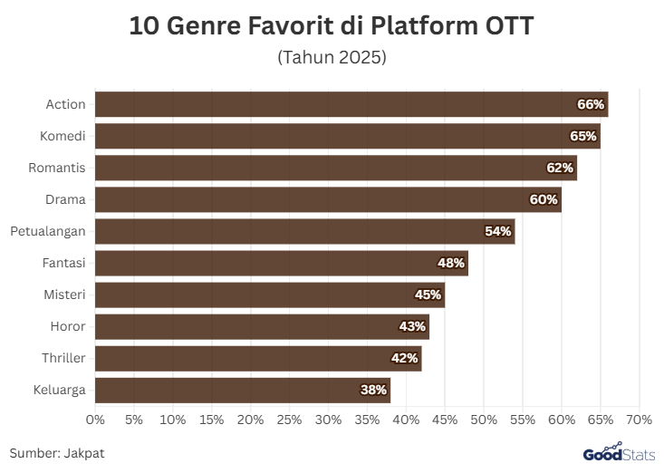 Menurut laporan Jakpat bertajuk Indonesia Mobile Entertainment & Social Media Trends, terdapat sepuluh genre yang menjadi pilihan publik Indonesia. Data ini didapatkan dengan mengumpulkan survei dari 901 pengguna platform OTT di Indonesia pada 27 Mei-3 Juni 2025.