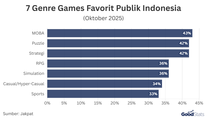 Menurut survei Jakpat bertajuk Indonesian Gaming Behaviour 2025, terdapat tujuh genre favorit pemain game online di Indonesia. Data ini didapatkan dengan mengumpulkan survei terhadap 1.203 responden pengguna internet pada 3-4 September 2025.