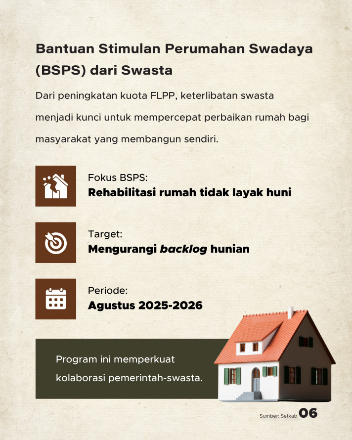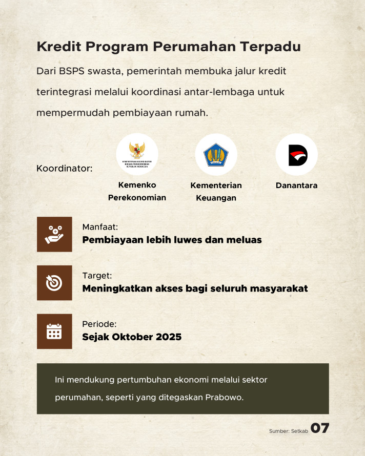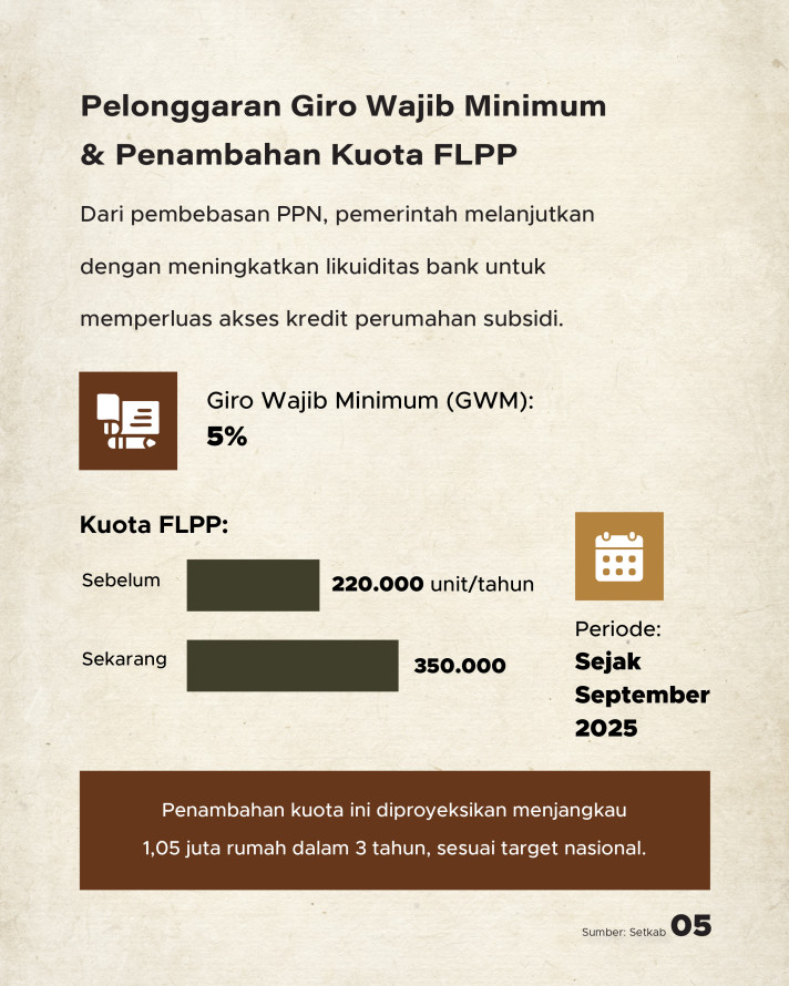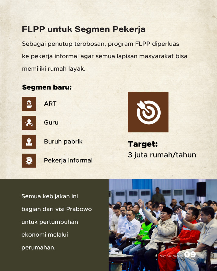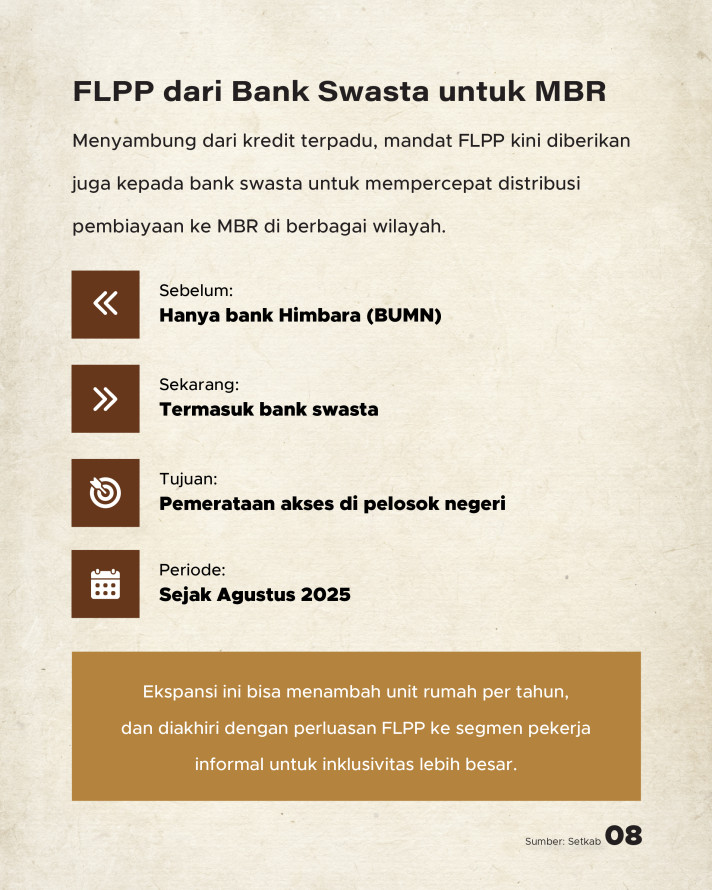 Kebijakan ini juga mencakup penambahan kuota FLPP dan ekspansi ke bank swasta untuk memperluas akses perumahan bagi semua lapisan masyarakat.