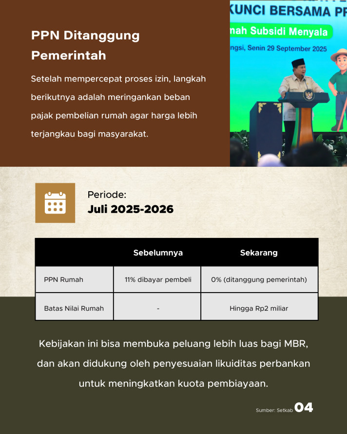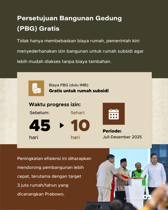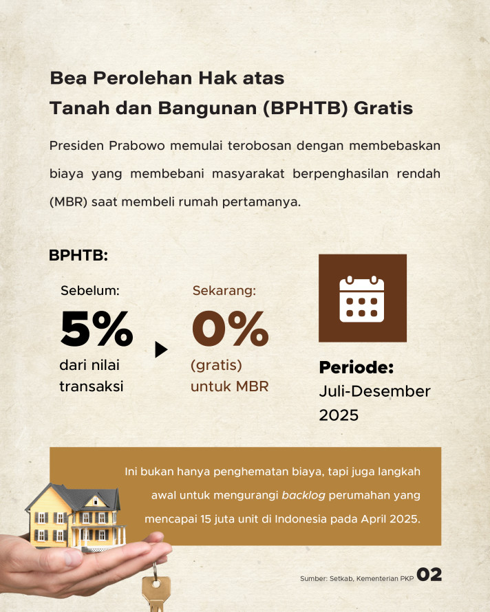 Presiden Prabowo meluncurkan kebijakan untuk mempermudah MBR memiliki rumah, termasuk pembebasan BPHTB dan PBG, serta PPN ditanggung pemerintah dengan target 3 juta rumah/tahun.