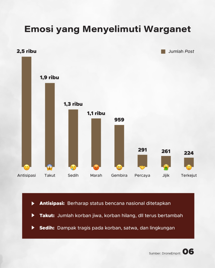 Lonjakan emosi warganet selama bencana Sumatra mengikuti pola umum saat krisis besar—di mana antisipasi,rasa takut, dan sedih memuncak lebih awal dibanding kemarahan.