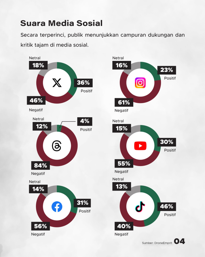Ketimpangan sentimen antarplatform menunjukkan bahwa percakapan visual seperti TikTok dan Instagram cenderung lebih suportif, sedangkan ruang teks seperti X dan Threads lebih cepat memicu polarisasi.