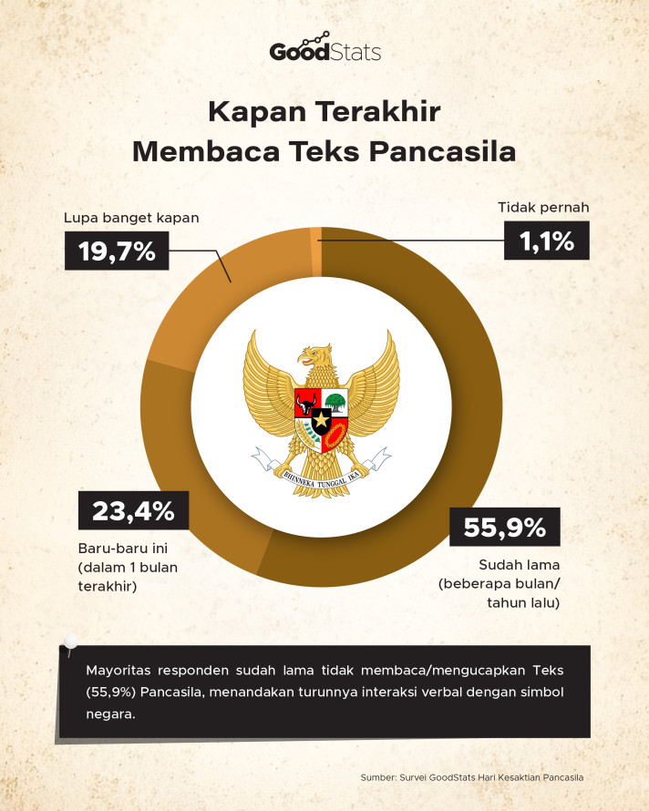 Menurut survei GoodStats, terjadi penurunan dalam interaksi verbal dengan simbol negara dalam kehidupan sehari-hari, terbukti dari sebagian besar responden yang sudah lama tidak membaca atau mengucapkan teks Pancasila (55%).