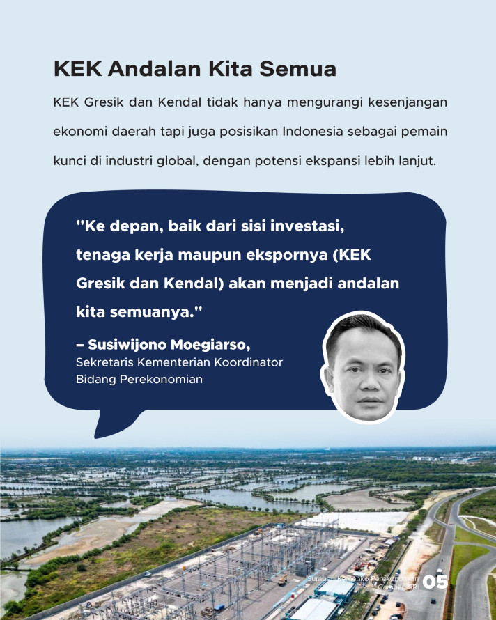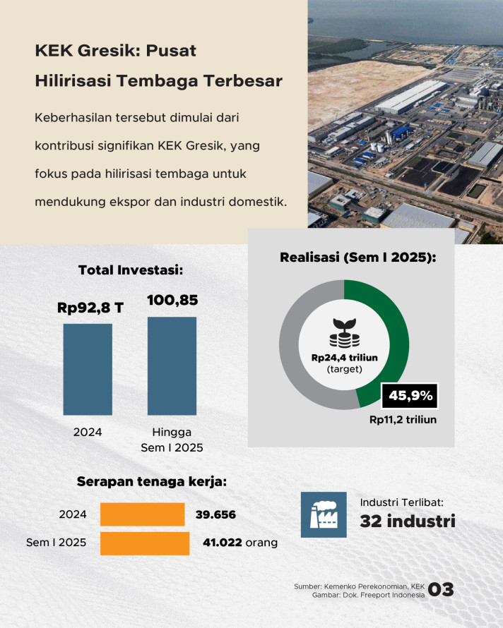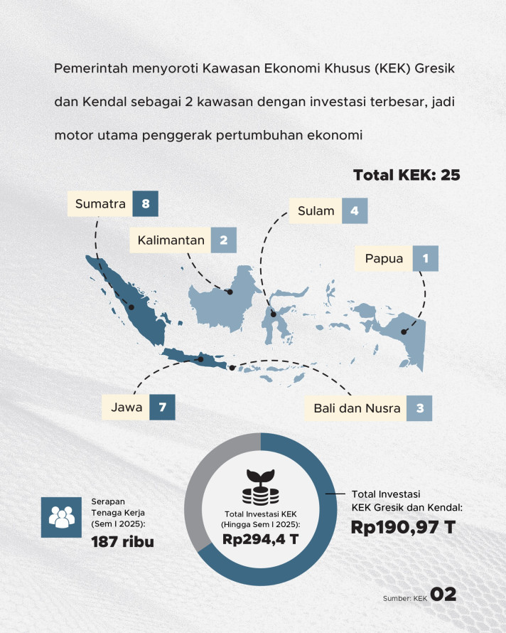 KEK Gresik dan Kendal menjadi dua kawasan dengan investasi terbesar di Indonesia, mencatat total Rp190 triliun dan menyerap 187 ribu tenaga kerja hingga semester I 2025. Keduanya kini menjadi motor utama penggerak ekonomi nasional melalui hilirisasi industri dan penguatan rantai pasok global.
