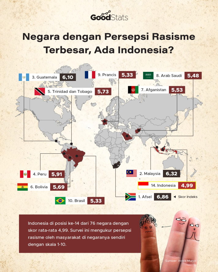Menurut Index Mundi dalam survey online berbasis web “Racial Discrimination Survey”, negara dengan skor tinggi tidak selalu negara dengan konflik ras terbuka, melainkan sering kali negara dengan masyarakat yang semakin vokal dalam mengakui dan melaporkan isu diskriminasi.